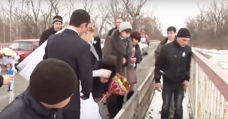 Случай из ролика ниже произошел в городе Лабинск Краснодарского края. Молодожены с гостями позировали на мосту, а после по обычаю, бросили букет невесты в реку.
