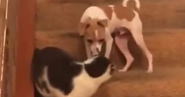 То, что собаки и кошки не находят общего языка и постоянно задевают друг друга — не для кого не секрет. Но то, что один может переключить другого на турбо-режим, такого вы точно не слышали и не видели. Собака, как обычно, доставала кота и тот дал сдачи, еле задев собаку лапкой. Но что вдруг началось!
